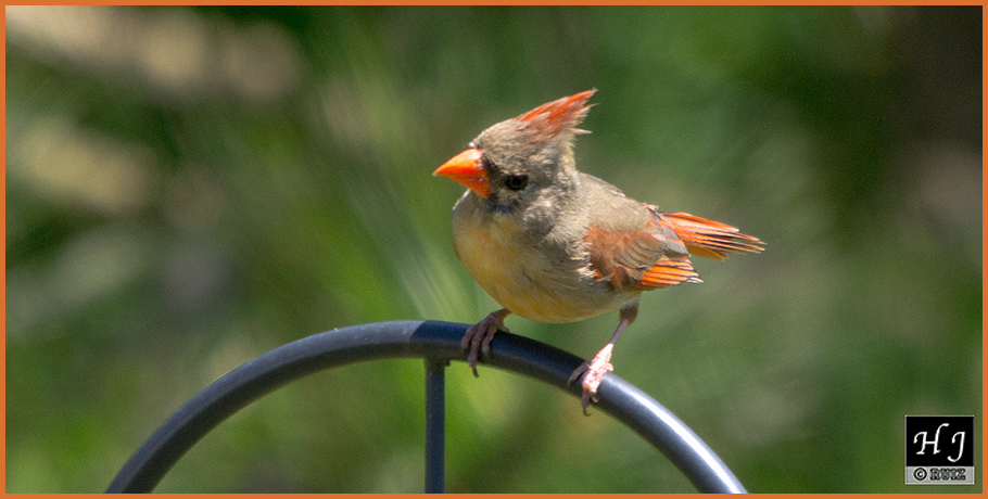 There on the left side on top of the feeder hanger, she’s a fledgeling female Northern Cardinal. There are several cardinal families living in my backyard all year round. I can hardly keep up with them or even try to give them names. This little beauty will grow to be a total stunning lady, I’m sure of that!L-189