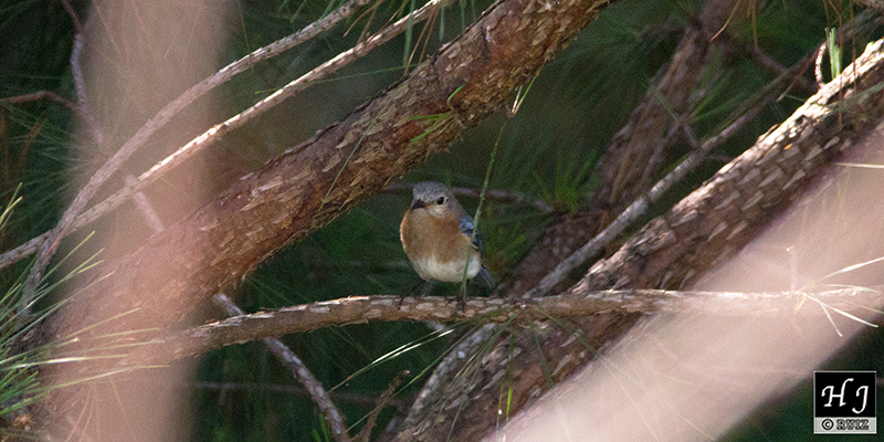 2- Female E. Bluebird awaits sheltered in a pine tree.