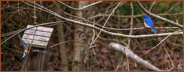 Yes, the female is leaving the nest box and the male is in the tree. Thanks Val! 🙂