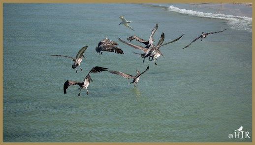 Pelicans, seagulls, terns, crows, even grackles were part of the hunt! Later, I saw seagulls chasing terns that had recently caught a fish to forcibly take the fish from the real owner.