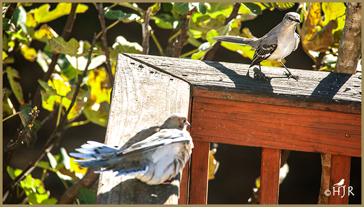 Oh, the feud is interesting. I thought the mourning dove was a blue Jay from its tail feathers and that is quite a firm stance that the Northern Mockingbird is taking.
