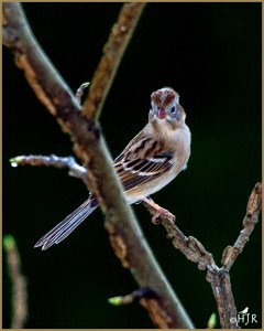 The Field Sparrow’s breeding habitat is brushy, shrubby fields across eastern North America. The nest is an open cup on the ground under a clump of grass or in a small thicket. These birds are permanent residents in the southern parts of their range. Northern birds migrate to the southern United States and Mexico.