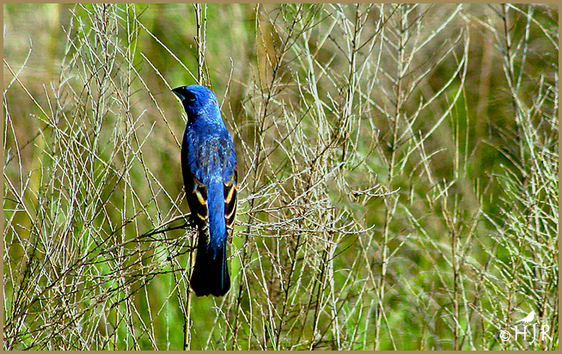 The male Blue Grosbeak is deep blue, with both black and brown on its wings. The female is mostly brown. Both sexes are distinguished by their large, deep bill and double wing bars. These features, as well as the grosbeak’s relatively larger size, distinguish this species from the indigo bunting. Length can range from 14 to 19 cm (5.5 to 7.5 in) and wingspan is from 26 to 29 cm (10 to 11 in). Body mass is typically from 26 to 31.5 g (0.92 to 1.11 oz).