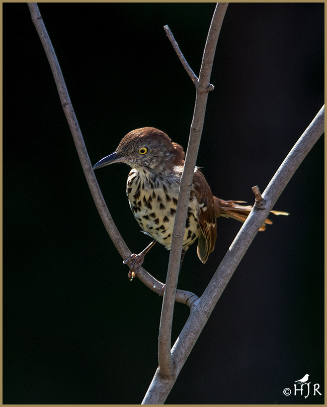 Your Eastern Towhee is an interesting bird and quite attractive HJ, and appears to get its name from its call, but your Brown Thrasher takes the cake, I had a feeling its name came from the way it killed its prey, as several of our birds thrash their prey before eating, even when it is an inanimate piece of meat or bread (our Kookaburra will do this as will the Bee-eater). it is a remarkable mimic and has an amazing repertoire from what I have heard has over 1000 tunes. It does look like a Thrush and is a beautiful bird. Thanks for sharing these birds we never see HJ. 🙂