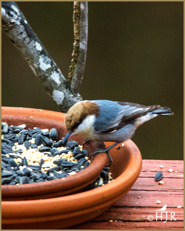 The Brown-headed Nuthatch (Sitta pusilla) is a small songbird found endemic to pine forests throughout the Southeastern United States..These little birds Stay though the winter in my backyard and are very energetic, also very smart, work all day picking seeds from the ffeders and takeing them to their nests.The bird, like other nuthatches, possesses a sharp black nail-like beak, which it uses to pound open seeds. It is a frequent visitor to feeding stations and is highly fond of sunflower seeds and suet cakes.