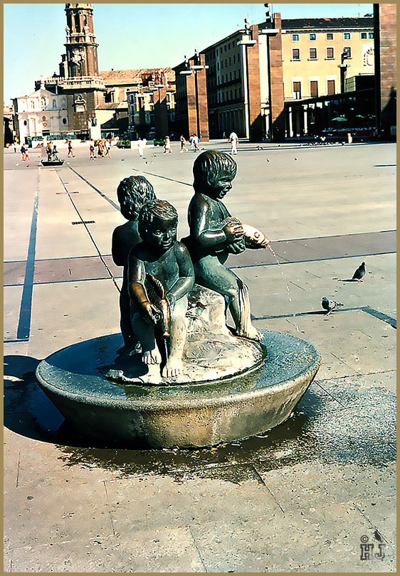 7 – 8 – Third Row: Bronze water fountain depicting children at play in great Plaza del Pilar, also, man walking up in front of a gorgeous door in Zaragoza.
