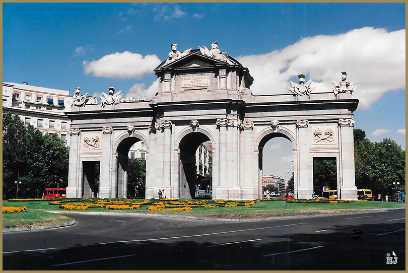 9 – Bottom Row – First column: The Puerta de Alcala monument in the Plaza de la Independencia (Independence Square) in Madrid, Spain.