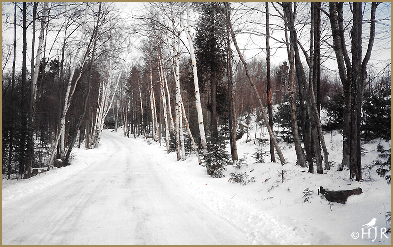 6 – Scene of a cold, yet bright day in Lake Placid, road going though the woods, in Upstate New York.