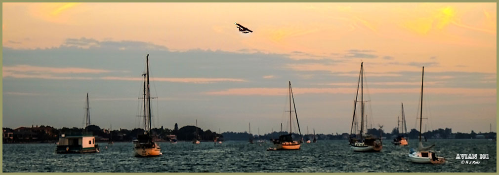 2 – Just before sunset, the seaplane is about to touch down on the Bay of Sarasota, Florida.