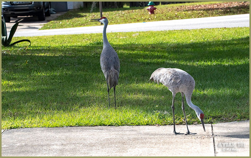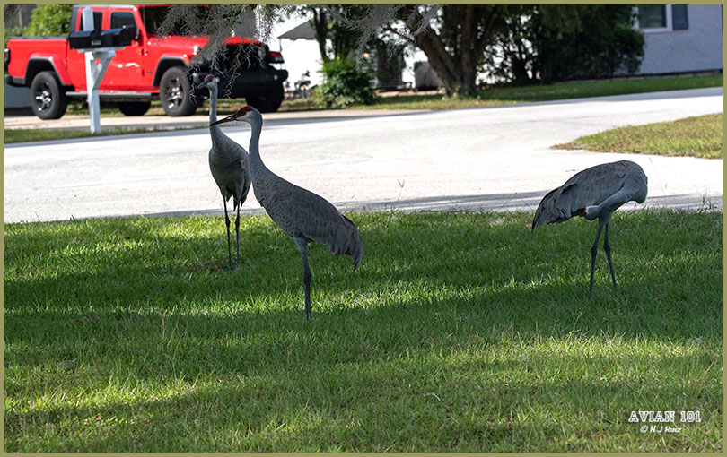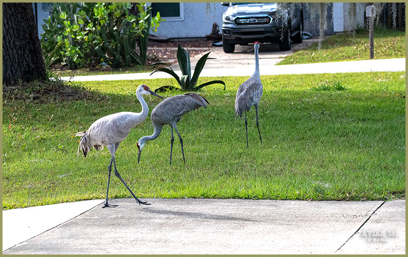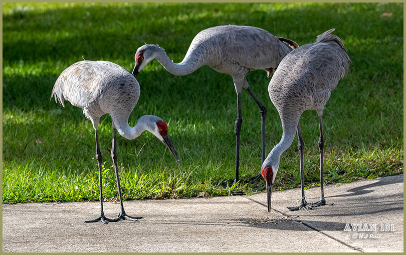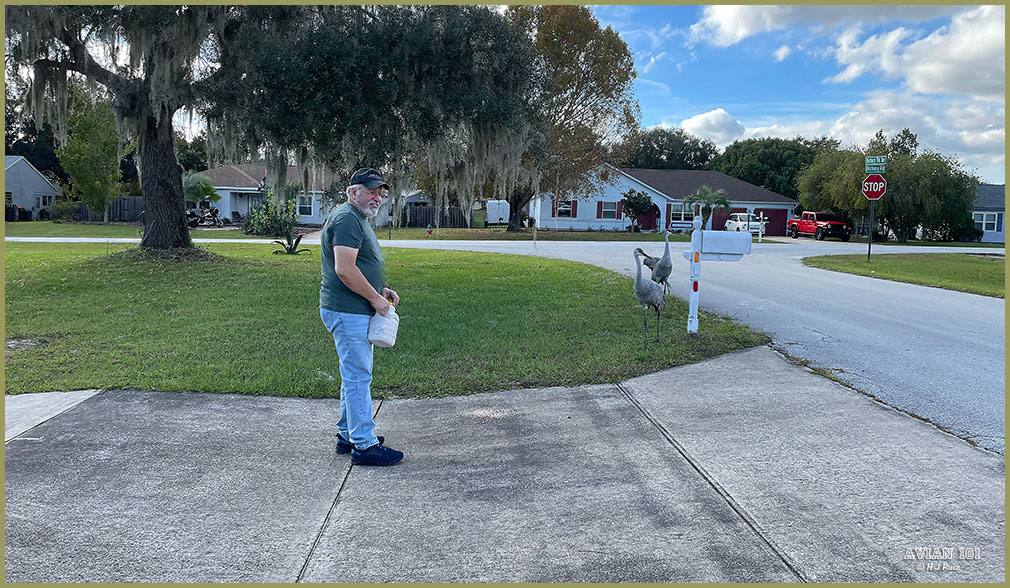 Imagine this: I had an appointment with my new primary MD for semestral check-up and then when I returned, these tthree Sandhill Cranes where on my front lawn. I was real elated to see this! Of course, I grabbed my camera before they flew away. I went outside and started to shoot my camera. In my mind I had the idea to lure them to stay longer. I asked my son Tyler to bring some seeds for birds. on the driveway of my garages. Just walk casually and don’t look at their eyes, but make sure that they see you place the seeds, then retreat back. They made sure we were at a safe distance, and one by one decided to venture…They loved the seeds! Next refills, we approached closer, they didn’t mind at all. These “three musketeers” stayed for over two hours! You have to chance to see me on the last photo, fully retired and a bit overweight, I’m sporting a full beard too. – H.J.