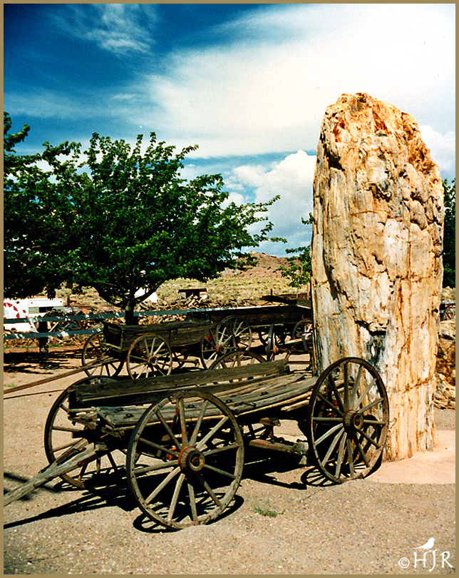 1 – An old horse wagon, next to a fragment of petrified tree trunk, in Arizona.