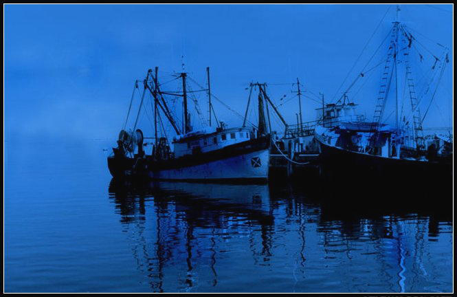 7 – The scene is a group of fishing boats docked, on a foggy morning. at one pier on Cape Cod, Massachussets ( The photo was toned blue for more artistic effect).