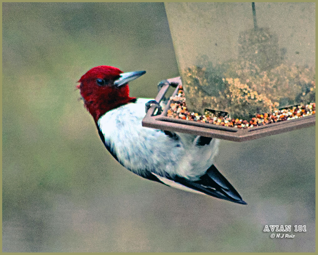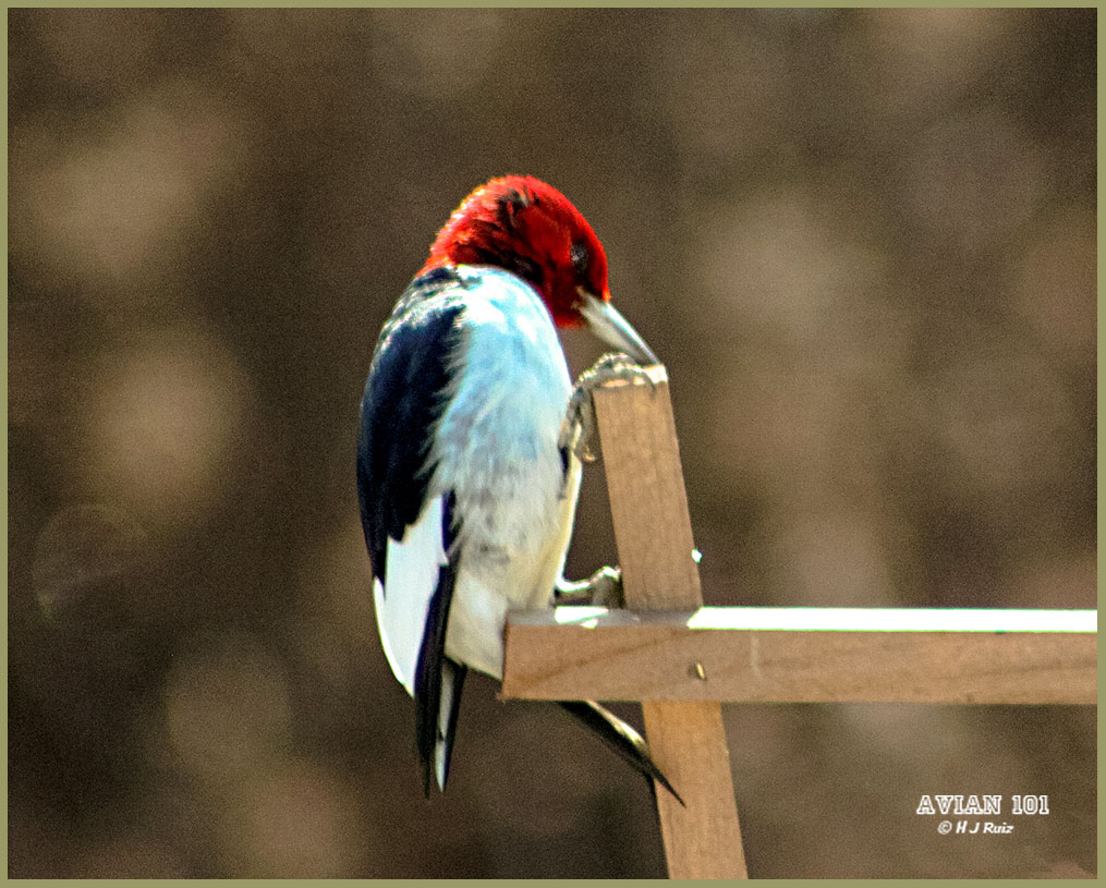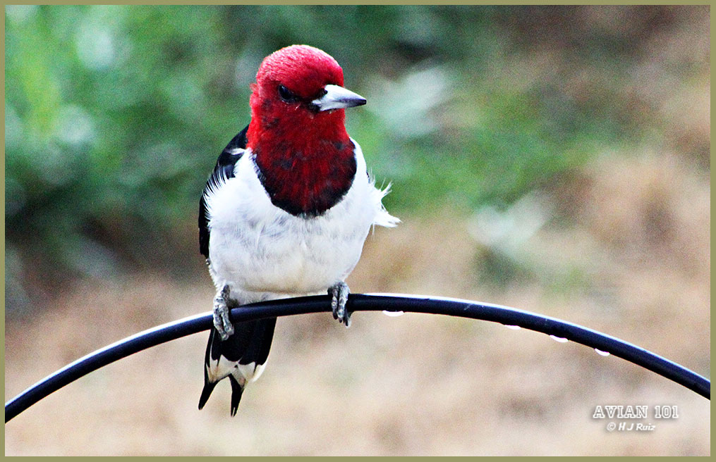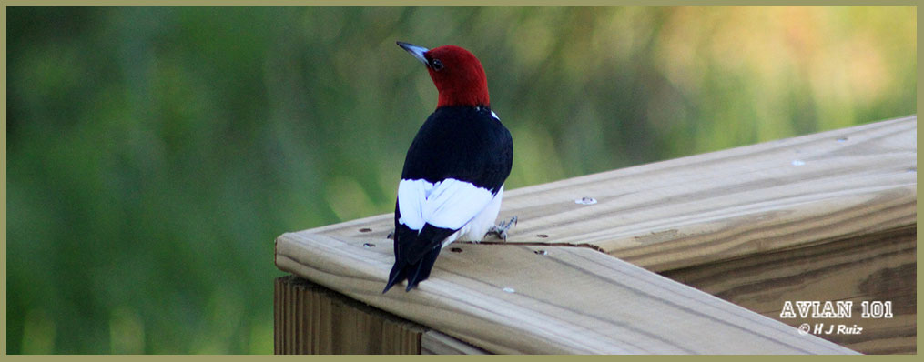 The Red-headed Woodpecker (Melanerpes erythrocephalus) is a mid-sized woodpecker found in temperate North America. Its breeding habitat is open country across southern Canada and the east-central United States. It is rated as least concern on the International Union for Conservation of Nature (IUCN)’s Red List of Endangered species, having been down-listed from near threatened in 2018. Adults are distinctly tricolored, with a black back and tail, a white belly and rump, and a red head and neck. The wings are black with white secondary remiges. Adult males and females are identical in plumage. Juveniles have similar markings, but their heads are grey. Red-headed woodpeckers are entirely crimson above their shoulders. These are mid-sized woodpeckers. Both sexes measure from 19 to 25 cm (7.5 to 9.8 in) in length, with a wingspan of 42.5 cm (16.7 in). They weigh from 56 to 97 g (2.0 to 3.4 oz), with an average of 76 g (2.7 oz) Each wing measures 12.7–15 cm (5.0–5.9 in); the tail measures 6.6–8.5 cm (2.6–3.3 in), the bill measures 2.1–3 cm (0.83–1.18 in) and the tarsus measures 1.9–2.5 cm (0.75–0.98 in). The maximum longevity in the wild is 9.9 years. This species gives a tchur-tchur call or a drum on its territory.