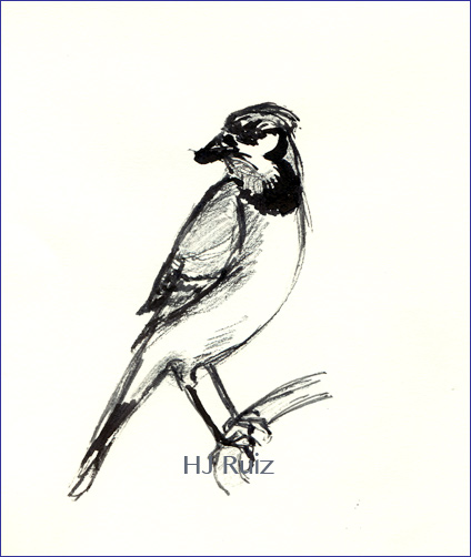 Blue Jay – Bamboo reed pen, black ink, 6×8″ on natural color drawing paper