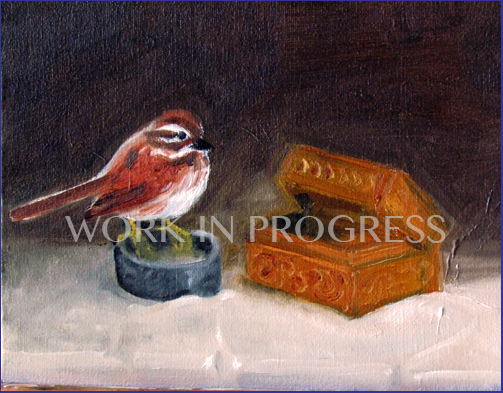 “Song Sparrow and wooden jewelry box” Oil on canvas, 8×10- Work in Progress