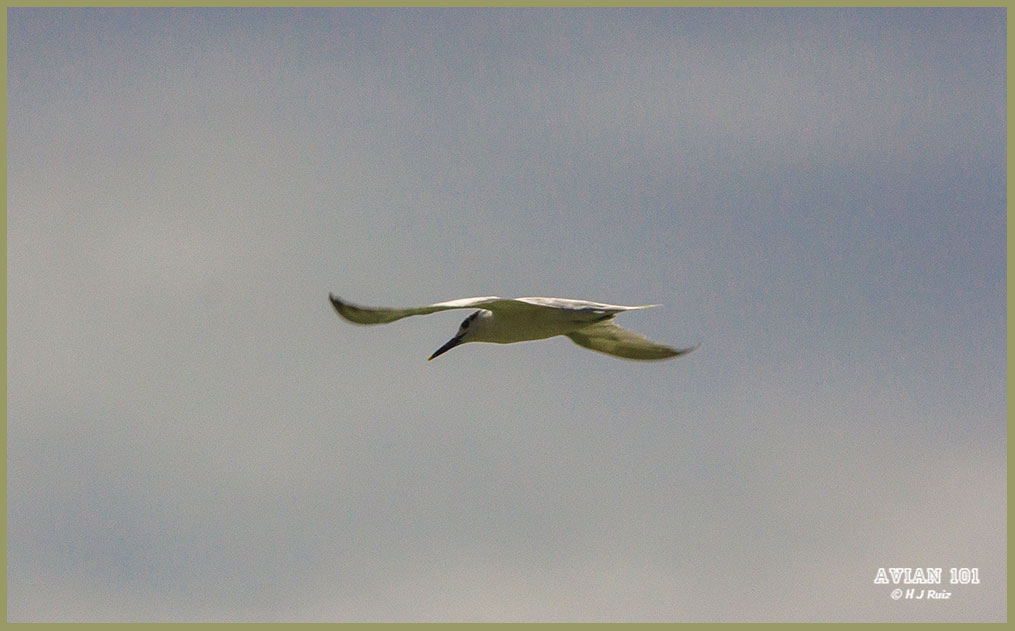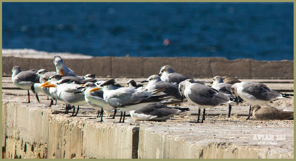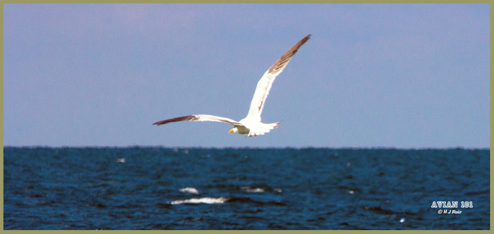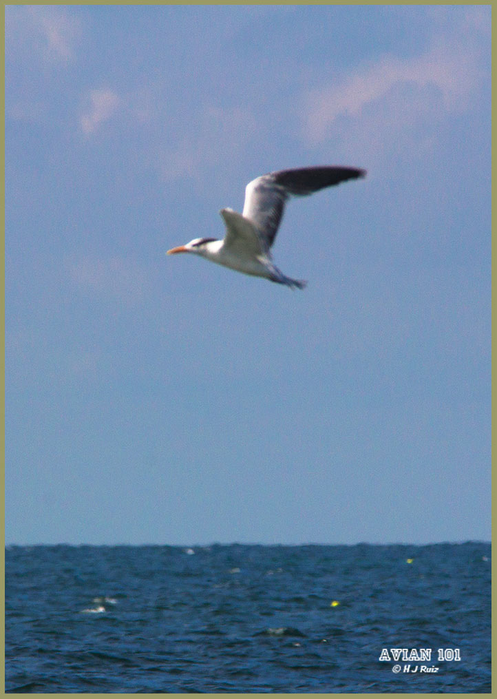 The Royal Tern (Thalasseus maximus) is a tern in the family Laridae. The species is endemic to the Americas, though strays have been identified in Europe. This is a large tern, second only to the Caspian tern but is unlikely to be confused with the carrot-billed giant, which has extensive dark under-wing patches. The royal tern has an orange-red bill, pale grey upperparts, and white underparts. Its legs are black. In winter, the black cap becomes patchy. Juvenile royal terns are similar to non-breeding adults. Differences include juveniles having black splotched wings and a yellower bill. An adult royal tern has an average wingspan of 130 cm (51 in), for both sexes, but their wingspan can range from 125–135 cm (49–53 in). The royal tern’s length ranges from 45–50 cm (18–20 in) and their weight is anywhere from 350–450 g (12–16 oz). The calls of the royal tern are usually short, clear shrills. Some of the shrills sound like kree or tsirr; the royal tern also has a more plover-like whistle that is longer, rolling, and more melodious. In parts of its range, the royal tern could be confused with the elegant tern, but the elegant tern has a longer, more curved, bill and shows more white on the forehead in winter.